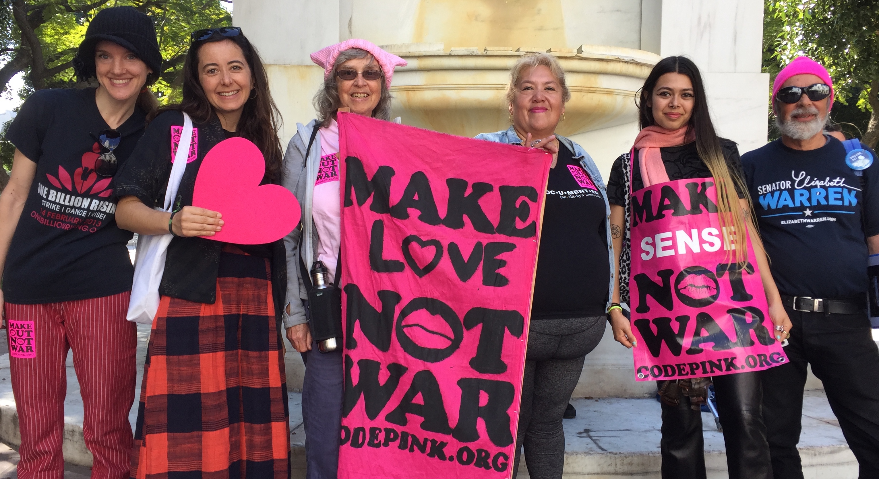We oppose the institutional, political, cultural and economic attacks on Muslim and migrant women, on Palestinian women, on women of color, working and unemployed women, on lesbian, gender nonconforming and trans women. We say "Feminism Not Militarism!"