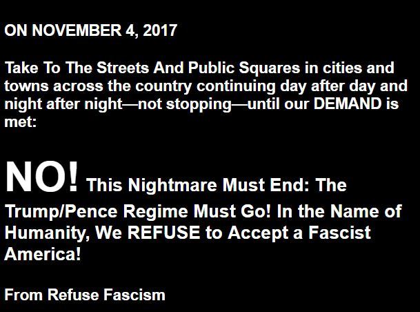 RefuseFascism.org has recently been the subject of numerous patently false articles posted on the internet that lie and distort its call for mass non-violent demonstrations to begin on November 4 and to raise the demand: This Nightmare Must End: The Trump/Pence Regime Must Go!